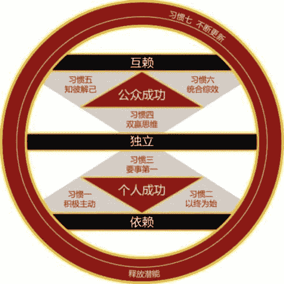 依赖显然不成熟,独立其实也不成熟,只有基于彼此优势的互相依赖,才是真正的成熟。今天,我希望大家能先理解“成熟模式图”,就是从依赖期,走过独立期,最终达到互赖期的两个阶段,七个习惯。积极主动、以终为始、要事第一,这三个习惯,帮你到达个人成功阶段;双赢思维、知彼解己、统和综效,帮你到达公众成功阶段。不断更新,帮你磨砺前六个习惯,越来越成熟。