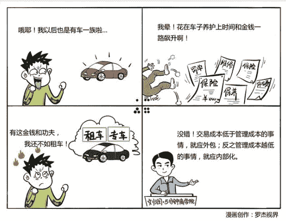 科斯说,是交易成本与管理成本的对比,确定了企业的边界。交易成本越低的事情,越应该外部化;管理成本越低的事情,越应该内部化。