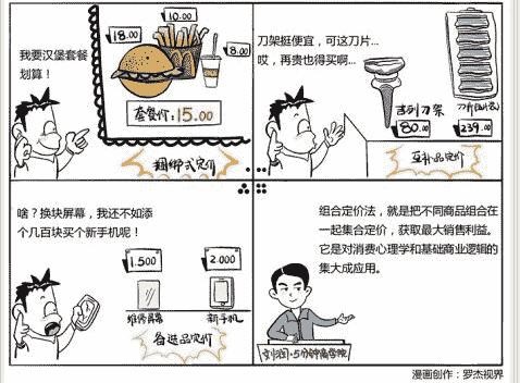 我想,这时你一定想起了“价格锚点”,并且立刻明白,那只汉堡被标价18元,就是为了让你觉得那15元的套餐便宜得逆天。你的决定,从“要不要吃”,就变为了“吃汉堡还是吃套餐”的选择。而且,你当然会在这两者之间,毫不犹豫地选择了套餐。汉堡店通过组合的方式,实现了有效的定价。