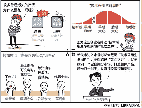 杰弗里·摩尔说,那是因为,这些勇敢的创业者,在技术创新的道路上一路狂奔时,掉进了“技术采用生命周期”的“死亡之井”。
