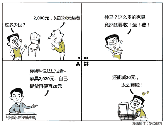 家具商场要收取20元的配送费,直接收取会触发消费者对于损失的厌恶心理,可以换种做法,将20元的配送费增加到产品的价格中,如果不需要配送,还可以便宜20元。