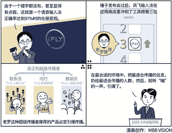 讯飞输入法之所以能引爆,不仅仅是因为产品好。产品好,从传播的角度来说,是不够的。或者说,至少是不够快的。想要快,就要找到类似于罗永浩这样“个别人物”。