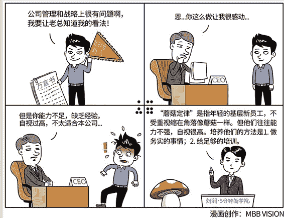 “蘑菇”是指,年轻的基层新员工,能力不强,自视很高。